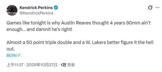 里夫斯这一战也证明了他在今年夏天拒绝湖人给出的4年8920万美元提前续约合同是明智的。名宿帕金斯在推特上写道:“今晚这样的比赛就是里夫斯认为4年9000万(实际为8920万)不够的原因。而且,天呐,他是对的。几乎拿下50分三双,而且拿到一场胜利,湖人最好弄清楚这件事。”