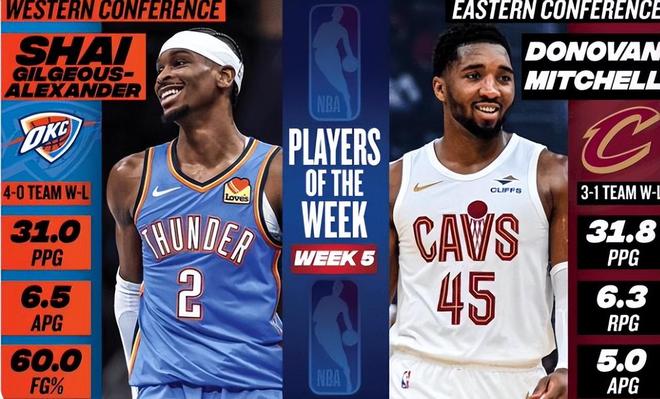 东部战绩第一的活塞在战力榜排名第4,骑士第5、湖人第6。其中,骑士球星米切尔和雷霆球星亚历山大,分别荣获上周东部和西部的最佳球员。