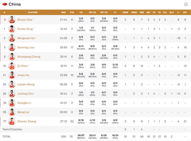 统计数据说明了中国队输球的原因:当然在于三分球差得太多了。韩国队31投14中拿到42分,命中率45%;而中国队26投仅6中拿18分,命中率仅23%。
