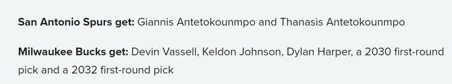 雄鹿得到:唐斯+麦克布莱德+达迪特+26年、28年、30年和32年首轮互换+6个二轮签。